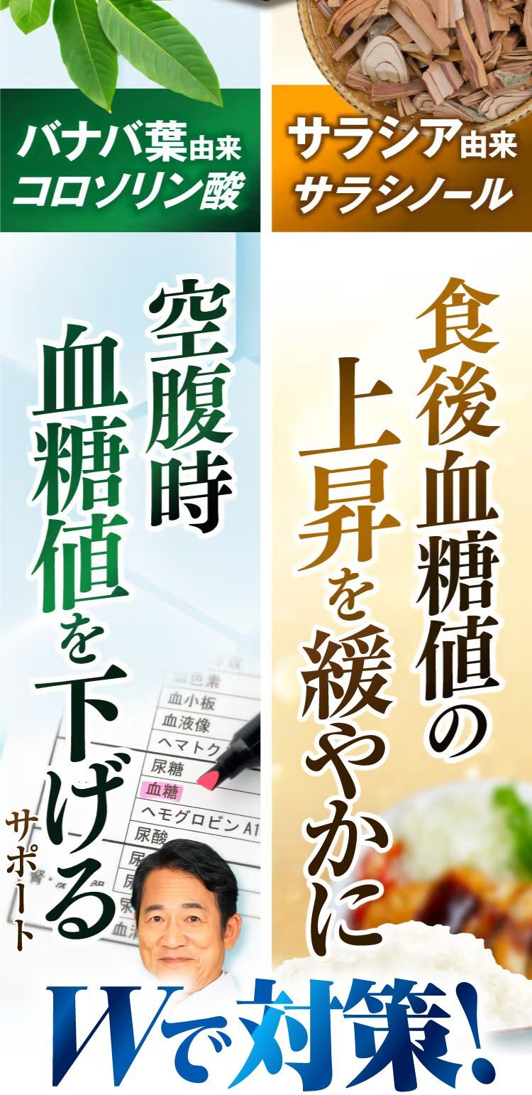 ※日本唯一の配合(バナバ由来コロソリン酸、サラシア由来サラシノール、GABA)