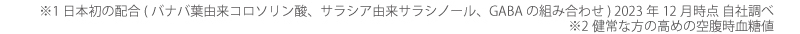 ※日本唯一の配合(バナバ葉由来コロソリン酸、サラシア由来サラシノール、GABAの組み合わせ) 2023年12月時点 自社調べ